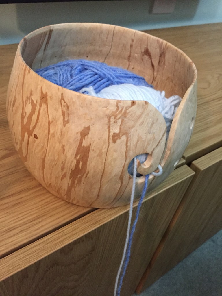 In the run up to the move, C had been collecting items for the house. She’d seen some lovely knitted pouffe/footstools and was wondering if it would be possible to make one. I thought the biggest issue would be the filling, but C had an old vinyl covered pouffe in her room filled with polystyrene beads. This would make a perfect base, almost firm enough to sit on or rest a tray on. We topped it up with more polystyrene beads from an old beanbag cushion.