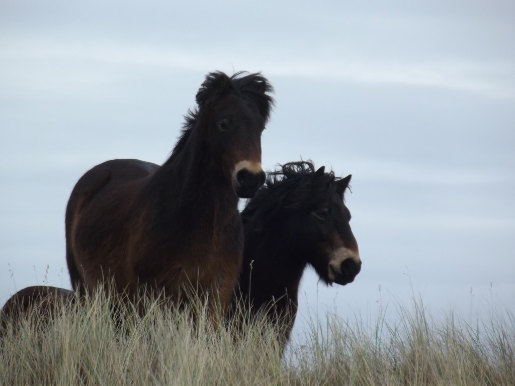 The Exmoors are very distinctive: bay with a pale “mealy” muzzle, pale underside and ring around the eye. We catch sight of them regularly when we drive up this stretch of coast, sometimes grazing, sometimes trotting along the dunes in a tight herd. It’s always lovely to see them.