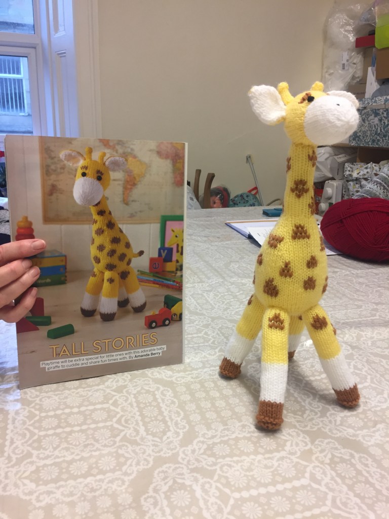First up this morning was the monthly group at The Amble Pincushion. Knit and Natter sessions are on the 3rd Friday of every month from 10am to 12, cost £4.50, including refreshments , raffle entry and 10% discount in the shop on the day. This lovable giraffe toy was made by one of the group for her baby granddaughter. It seems to have started a trend because, by total coincidence, another group member won a knitting kit in the raffle, to make, as you’ll have guessed……a giraffe.