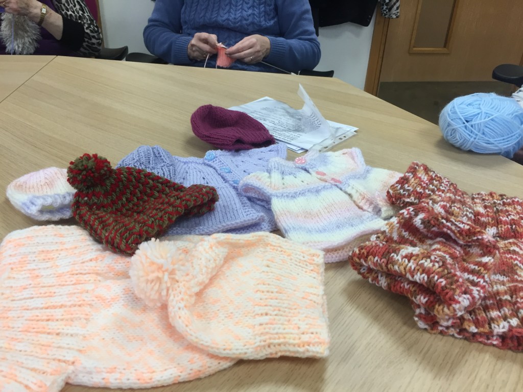 It’s been another productive week for the Knit and Natter Group, who brought along these items for the charities we support. We meet every Friday from 2.30-4pm at Alnwick Medical Group’s Lower Building. Work in progress today included a jumper, a baby cardigan, a colourful bag, socks, and a hat to match the lovely purple and white premature baby coat in the picture.