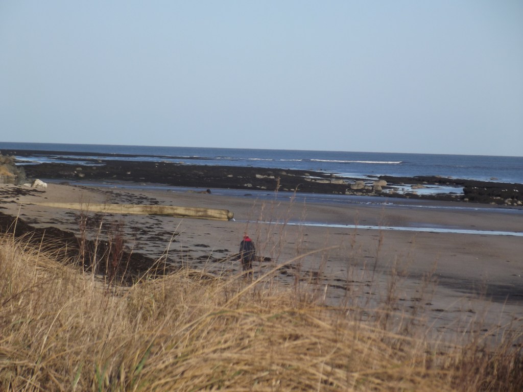 A different beach and a different project today. I’m making great progress with the New Year Resolutions too. We went to Boulmer (pronounced Boomer) and while K took the dog for a walk I knitted some stitches by the sea (definitely working on Resolution #6). This UFO is a project that’s been hanging about for a while: a cobwebby scarf in fine mohair yarn on 10mm needles made in garter stitch. This was sitting in the bottom of my knitting bag where it’s been on standby to be worked on in knit and natter groups if the other project I have taken with me requires too much concentration to allow simultaneous nattering and knitting. Must crack on and finish this one (Resolution #4)