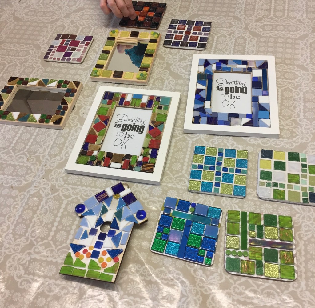 Grouting really makes the colours pop. We used plain white, but you can use acrylic paint to tint the mix. I’m really pleased with the result. As time was running out I brought some grout powder home and completed my photo frame today, removing the glass from the frame first and ensuring that there was no grout left in the corners to stop the glass going back in later. There was enough mixture left to fill in a couple of tiny gaps I noticed in one of the coasters too.