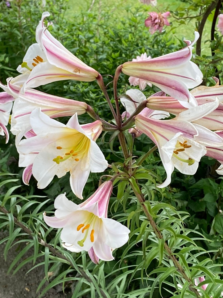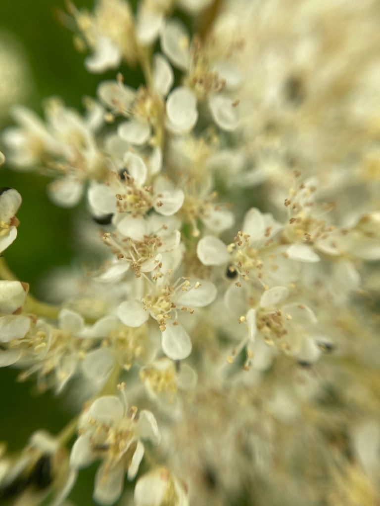The flowers, which appear from June onwards in groups on the side shoots, usually have 5 white or pale pink petals.