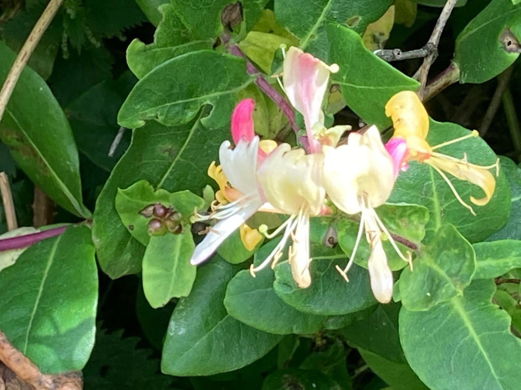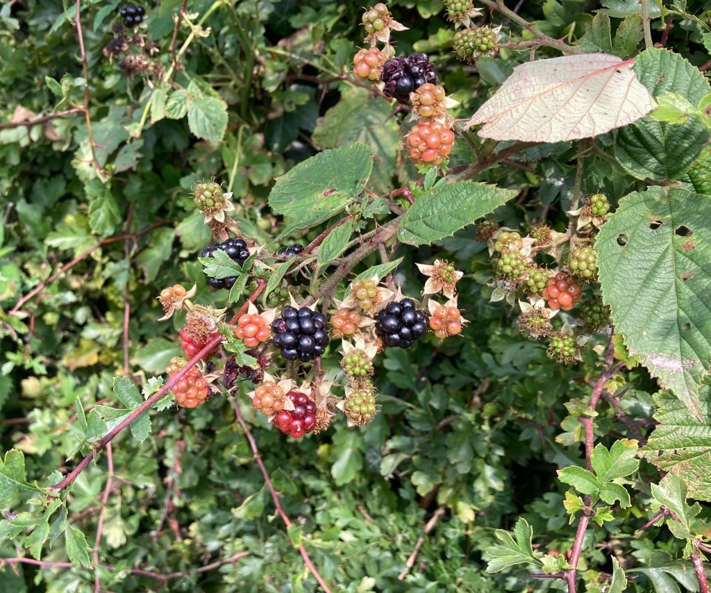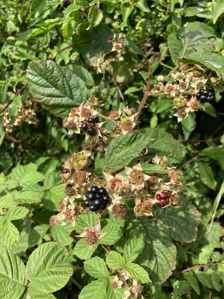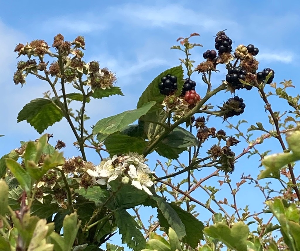 These are followed by the blackberries – technically not a fruit, but a cluster of drupes. These are green as they begin to develop, turning red through purple to black as they ripen. The ruit are easy to distinguish from the raspberry when they are picked – the raspberry detaches from the plant leaving its core behind on the plant so each picked berry has a hollow centre. The white core or torus of the blackberry detaches with the the fruit.