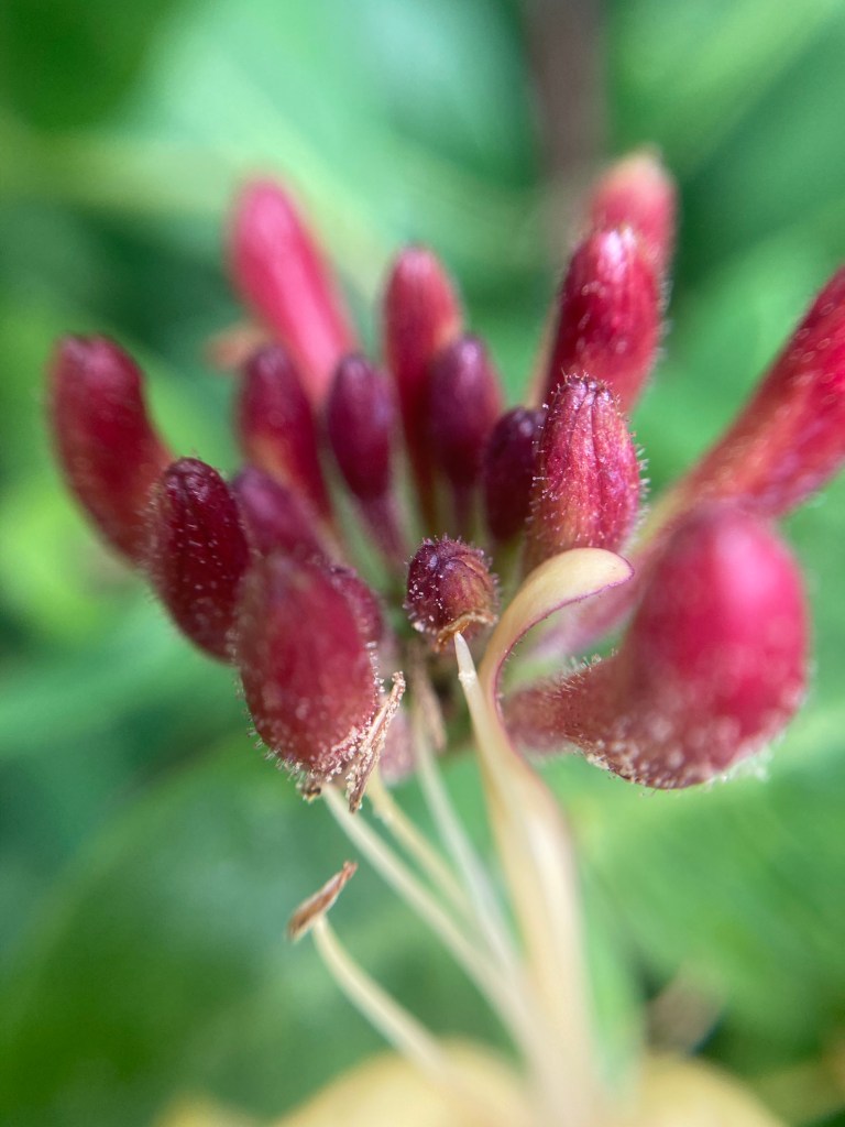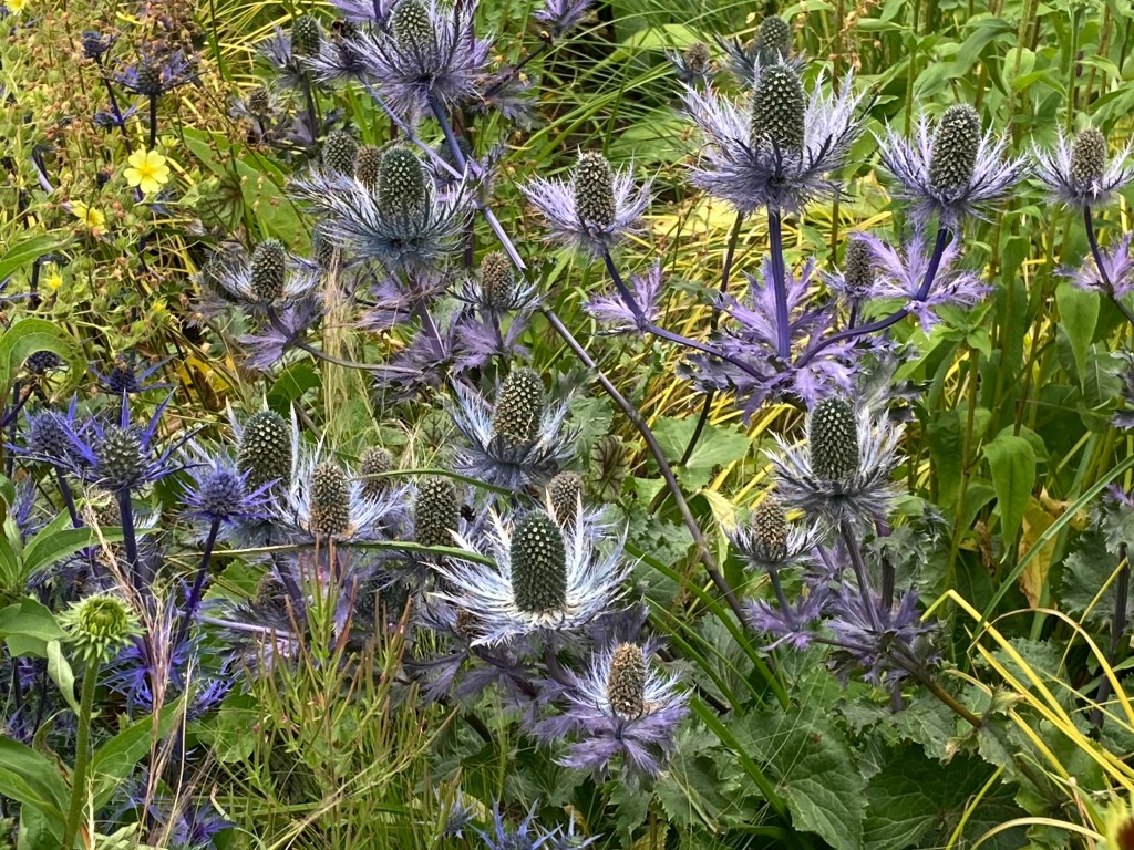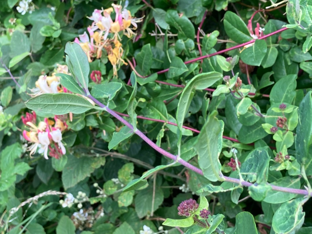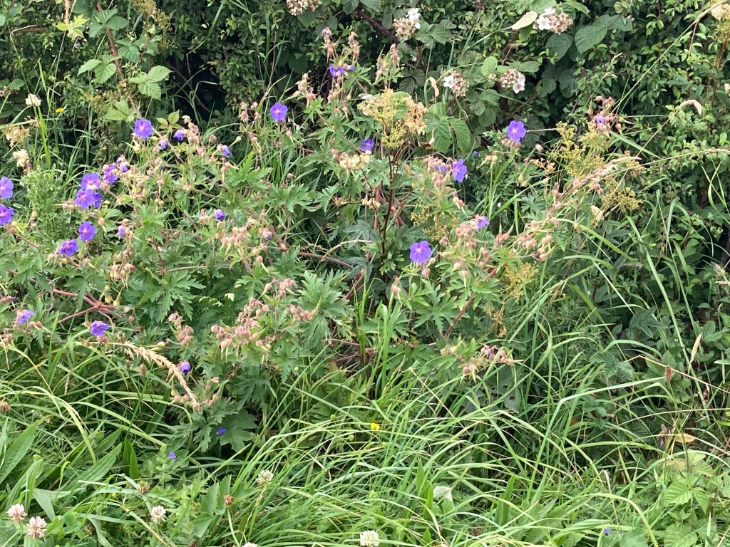 These are followed by the blackberries – technically not a fruit, but a cluster of drupes. These are green as they begin to develop, turning red through purple to black as they ripen. The ruit are easy to distinguish from the raspberry when they are picked – the raspberry detaches from the plant leaving its core behind on the plant so each picked berry has a hollow centre. The white core or torus of the blackberry detaches with the the fruit.