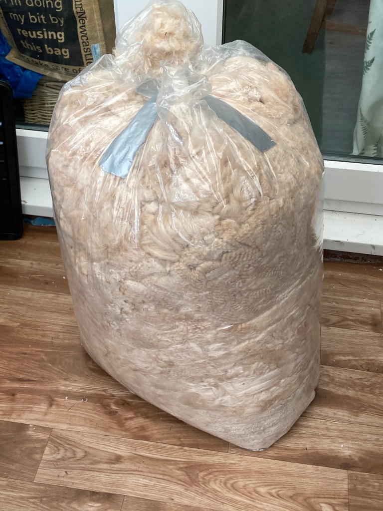 I’ve been reading up how to process the fibre and I’ve partially skirted the first fleece. This involves separating out the soiled fibres and the shorter and coarser parts from the edges and removing second cuts (the shorter tufts where the shearer has gone over the animal a second time). Some of this is perfectly usable – but what is left is the best quality long fine fleece from the back of the animal.