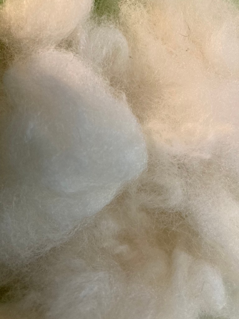 The fleece holds a lot of dust, some of which falls out during the skirting process. The next stage is to wash the fibre. To do this I put the fibre into mesh bags (the sort you use for laundering underwear) . I added some wool wash liquid to hand-hot water and gently immersed the bags. The wet fleece must be handled very carefully or it felts together, so I just left it to soak for 20 minutes, then drained the water and lightly pressed on the bags to remove some of the water. I then added clean water of the same temperature (sudden temperature changes damage the fibres) to rinse the soap away. In some respects alpaca fibre is easier to wash than sheep’s wool ,which is rich in lanolin and takes repeated washing to remove). The water was now clear so I drained it, pressing gently on the bags remove water, then placing the bags between towels and pressing gently again. I then allowed the fleece to dry. It has cleaned up to a beautiful pure white, which offers so many possibilities for experimenting with dyes…..that’s a whole new craft in itself.
