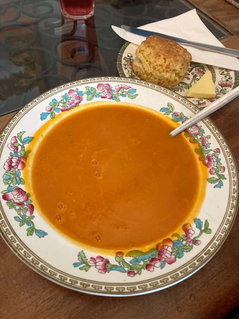 I ordered the red pepper and tomato soup with a cheese scone – a perfect combination. The soup was full of rich sweetness and flavour, a generous serving at the perfect temperature (I like my soup hot, but not too hot to eat) The scone was also well-flavoured, nicely crusted on the outside and soft inside, served warm with a big slice of butter.