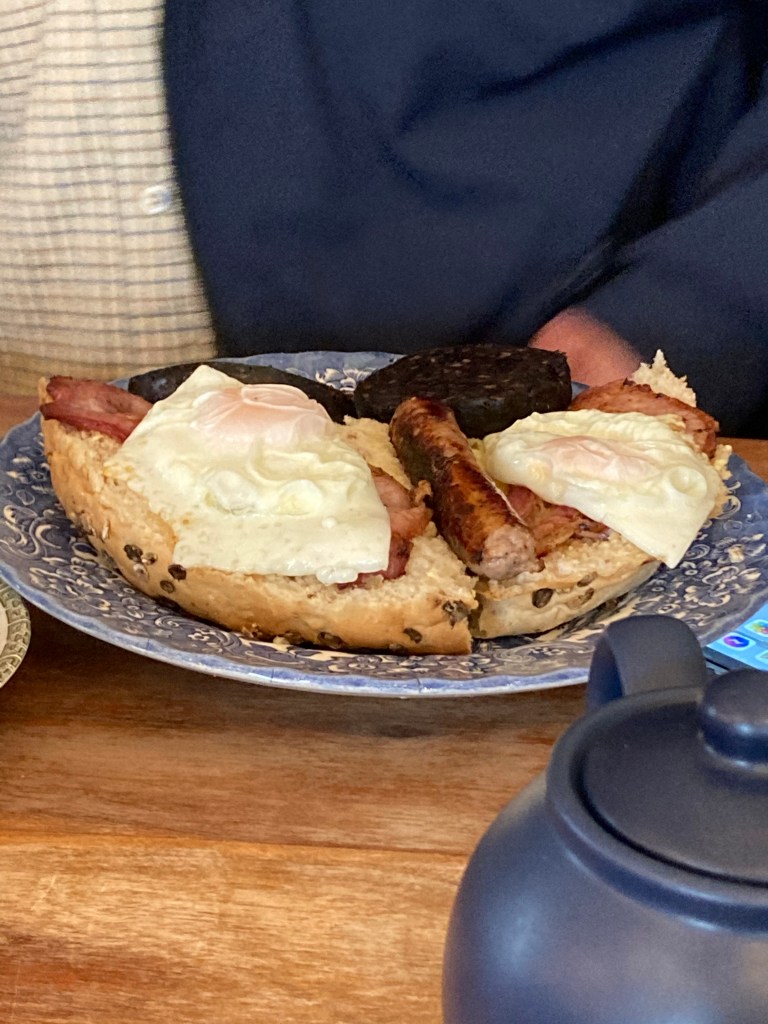 K had the all day breakfast stotty: bacon, sausage, 2 fried eggs and black pudding served in a stotty cake (that’s our regional speciality bread – a large flat bread roll). He really enjoyed it…