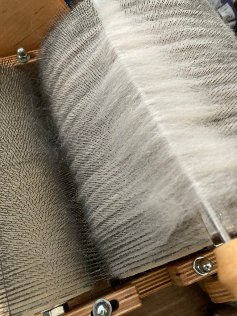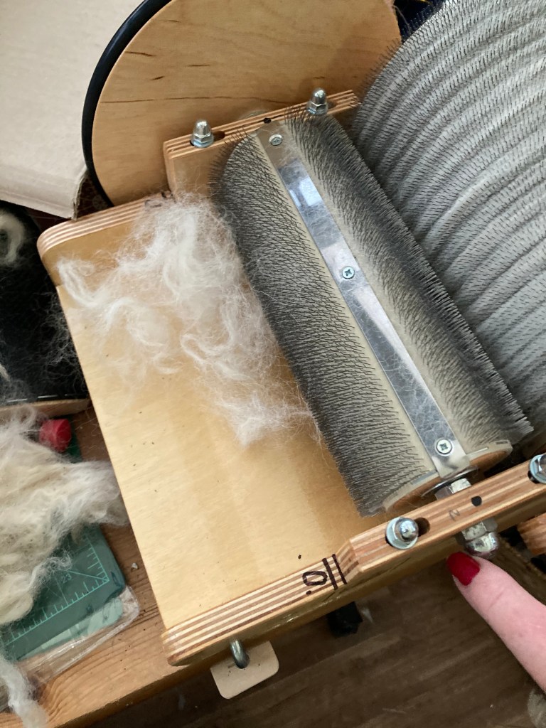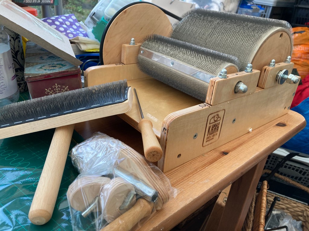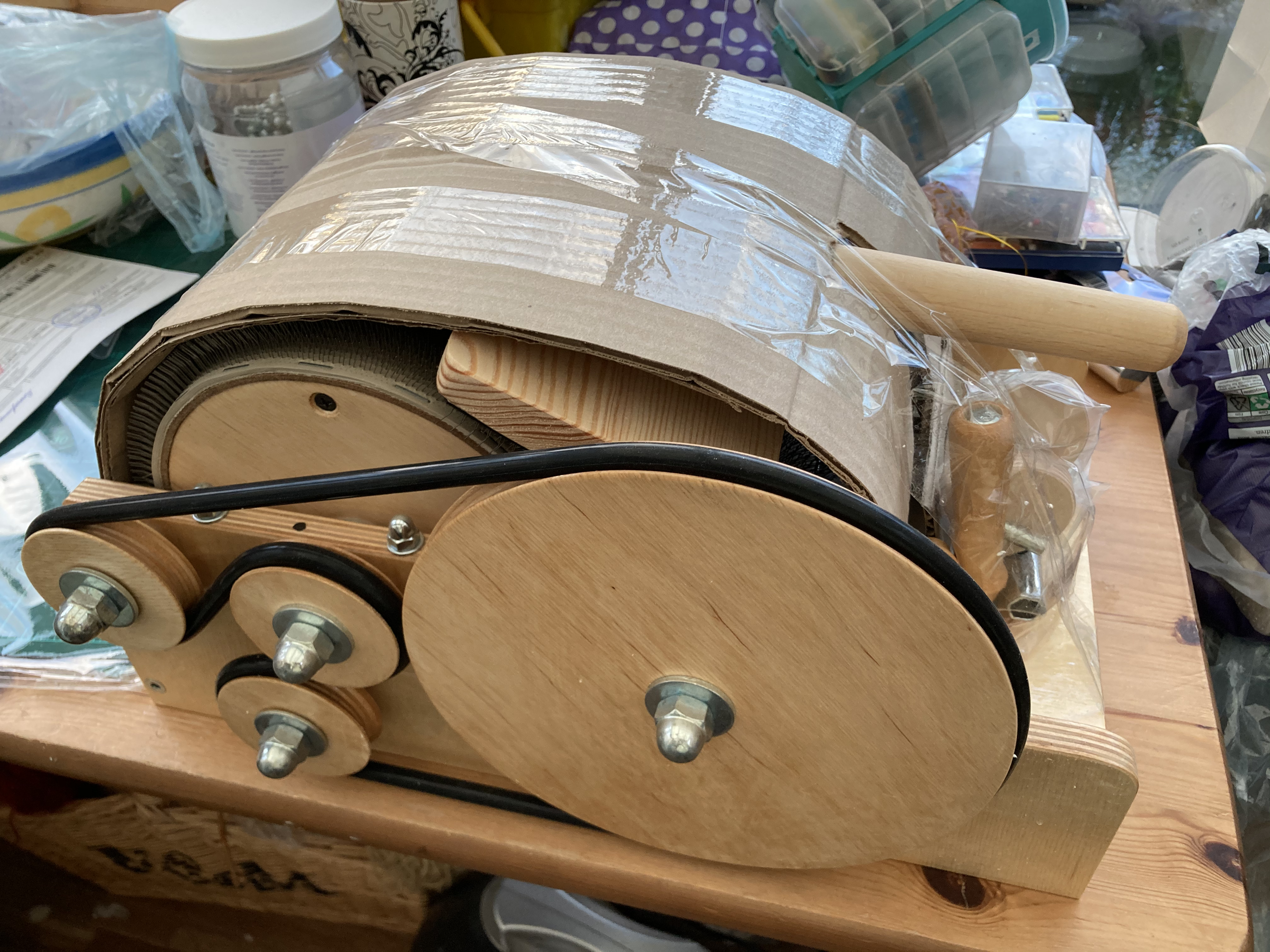 It came with a hand card (to clean the drums?) and a doffer (a long spike used to remove the batt of fibre from the drum) – I do love that there is a whole new vocabulary attached to spinning and fibre preparation.