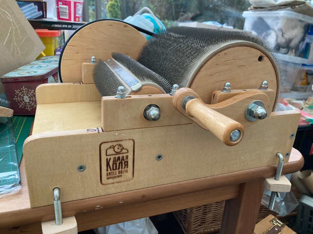 Having spent hours hand carding alpaca fibre over the last few weeks I’d been dreaming of owning a drum carder, but it did seem to be something of an extravagance until one of my fellow Knit and Natterers told me about hers. She found it on Etsy and it came from Russia. It was much cheaper than the well known makes and works really well. I looked online and found the seller. Sure enough, full size manual drum carders were available for under £200 plus post and packing and the reviews were excellent, so I took the plunge and ordered one. The only negative stated on the reviews appeared to be delivery time, but I was in no particular hurry. I was delighted when just 16 days later, on Christmas Eve, a large package arrived from Ukraine (not quite Russia). Today I finally unboxed my new drum carder and used it for the first time.