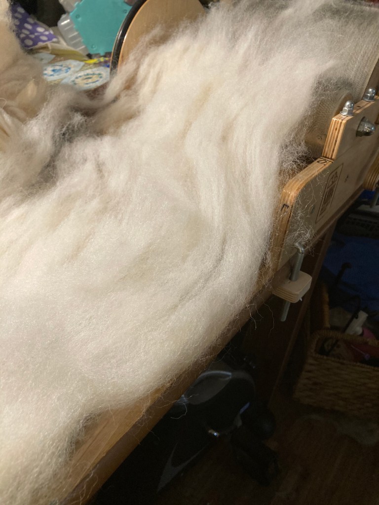 I couldn’t wait to get started so I grabbed some alpaca that I washed the other week, teased it out and gradually fed it in until the large drum was covered.