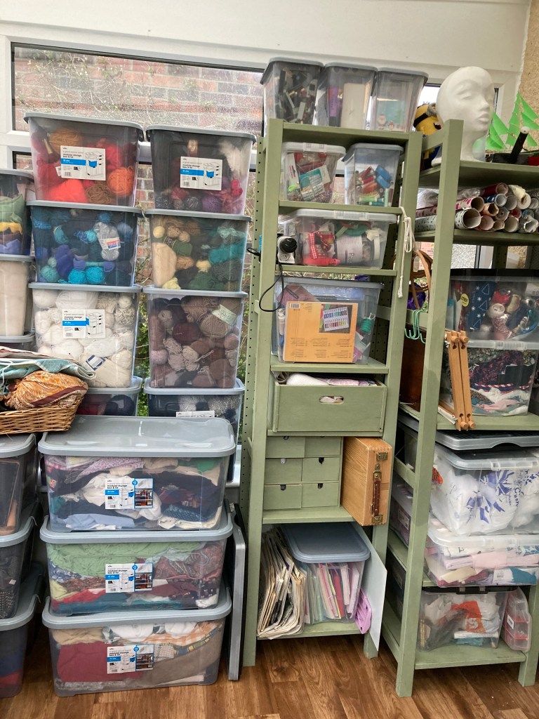 The candle-making kit, has invaded the garage, also known as K’s man cave (and he want’s it out) but everything else is in the conservatory, which is where I do my crafty activities. It had become a sorry mess. Until recently I shared the space with son’s drum kit, but that’s gone now. Also, I recently got a second hand microwave that I plan to use for dyeing fibre and yarn. I needed to move things around to accommodate that. I bought a load of plastic crates and, with a lot of help from daughter, who has been an absolute star, we’ve sorted the space out. I love it!