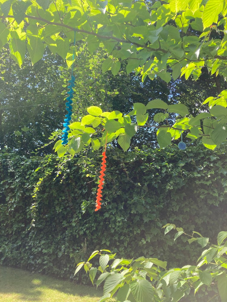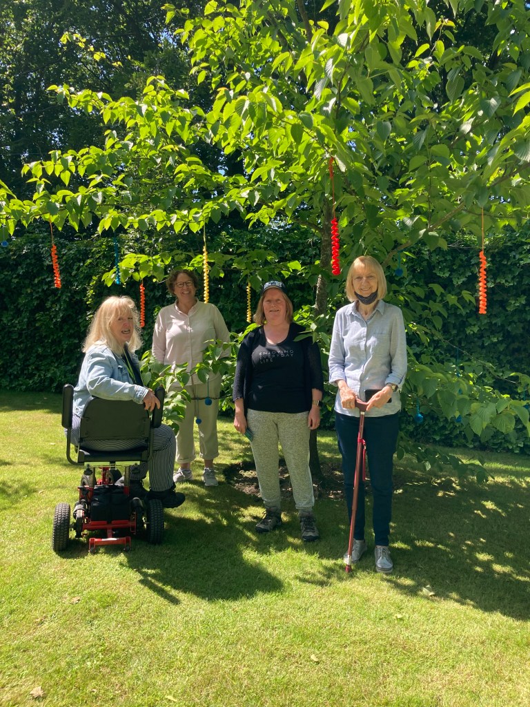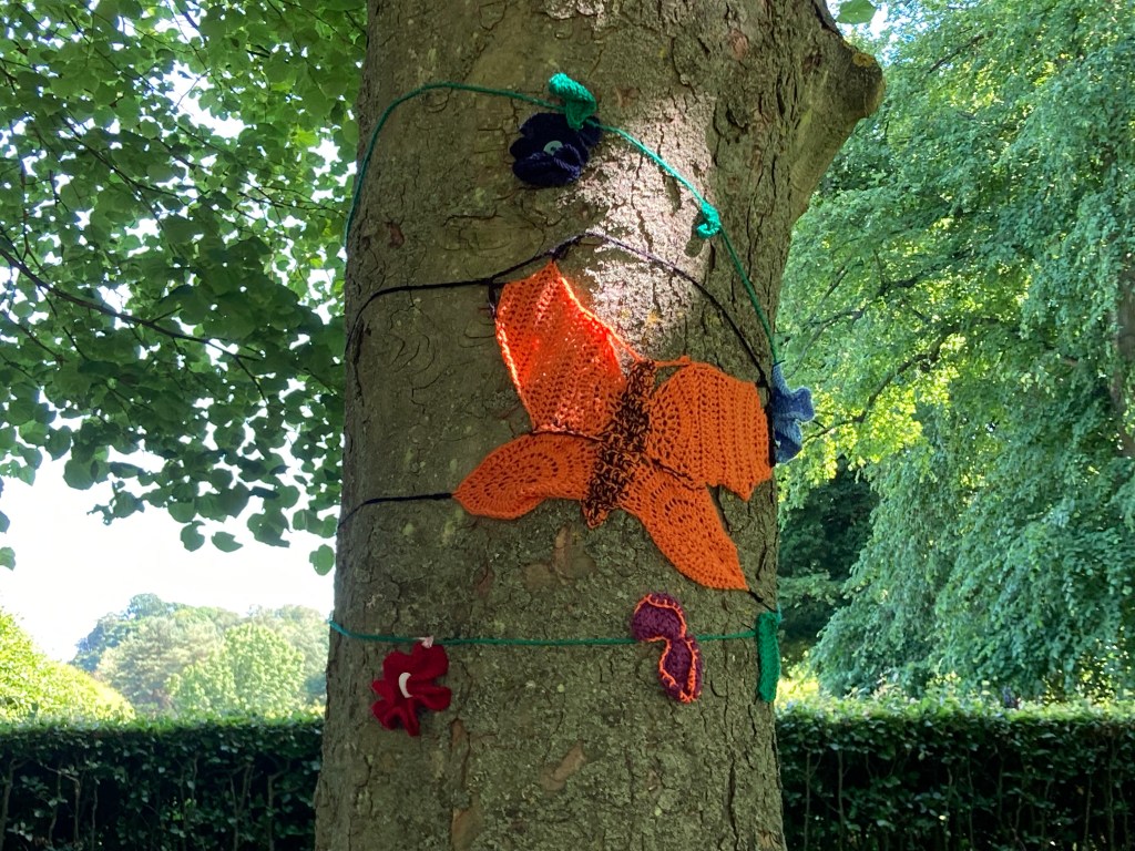 A few weeks back four of us visited the garden and chose this wooded area beyond the Rose Garden as the focus for our decorations. Members of our group have been making items for the project for a while but we were inspired with even more ideas once we knew the space we’d be using. Other parts of the garden are ablaze with colourful flowers at this time of year but the shady trees and the bright green foliage or our adopted patch provided a perfect backdrop for the colourful items we made. Last week we were back to install our work, with the support of one of the staff who has organised the event. Some other parts of the garden had already been decorated as we saw on on our way to our chosen site. The items had been made by other groups and also ndividuals, who have been leaving items for the staff to use for the decorations. We got to work….here are are the fruits of our labours!