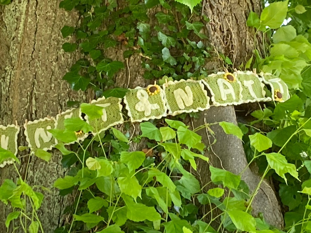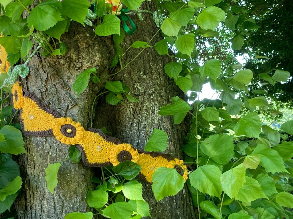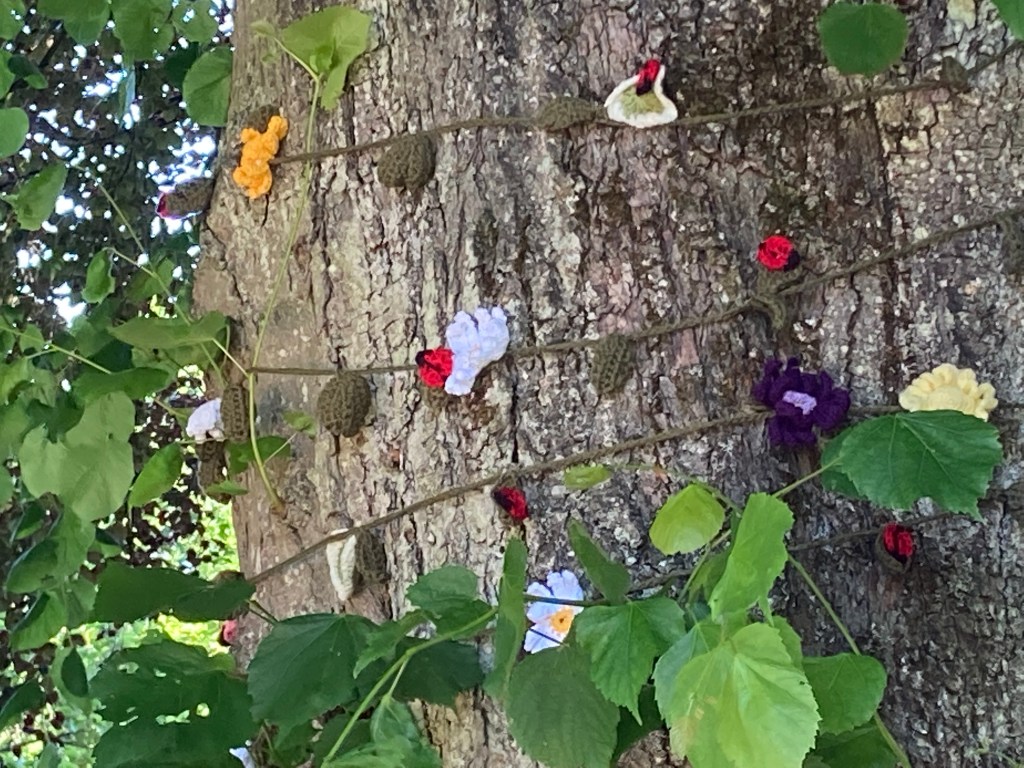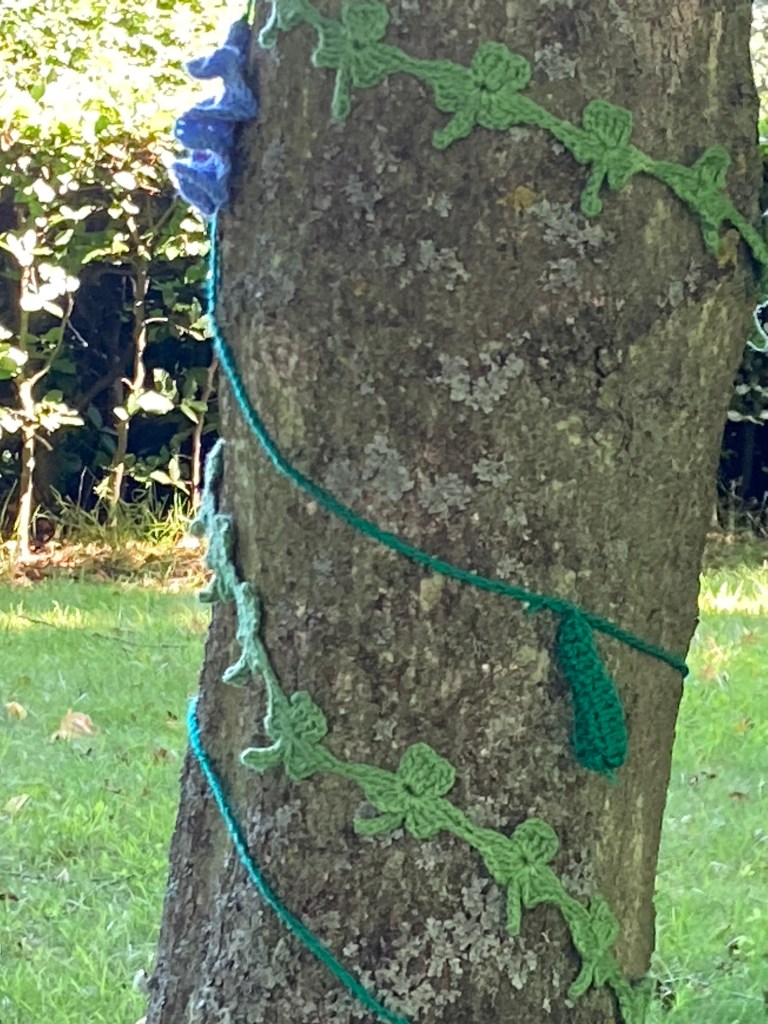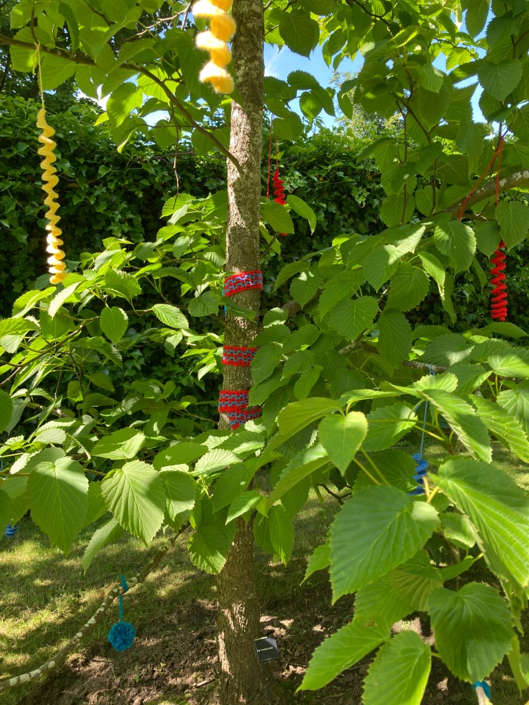 Finally, this “Knit and Natter” banner (made by A) was fixed to a large tree near the path.