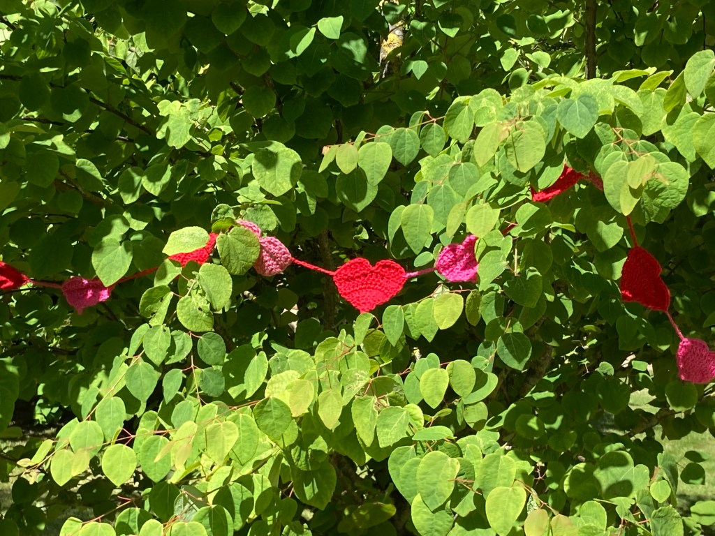 We draped a garland of hearts on another tree and wrapped more around a large trunk.