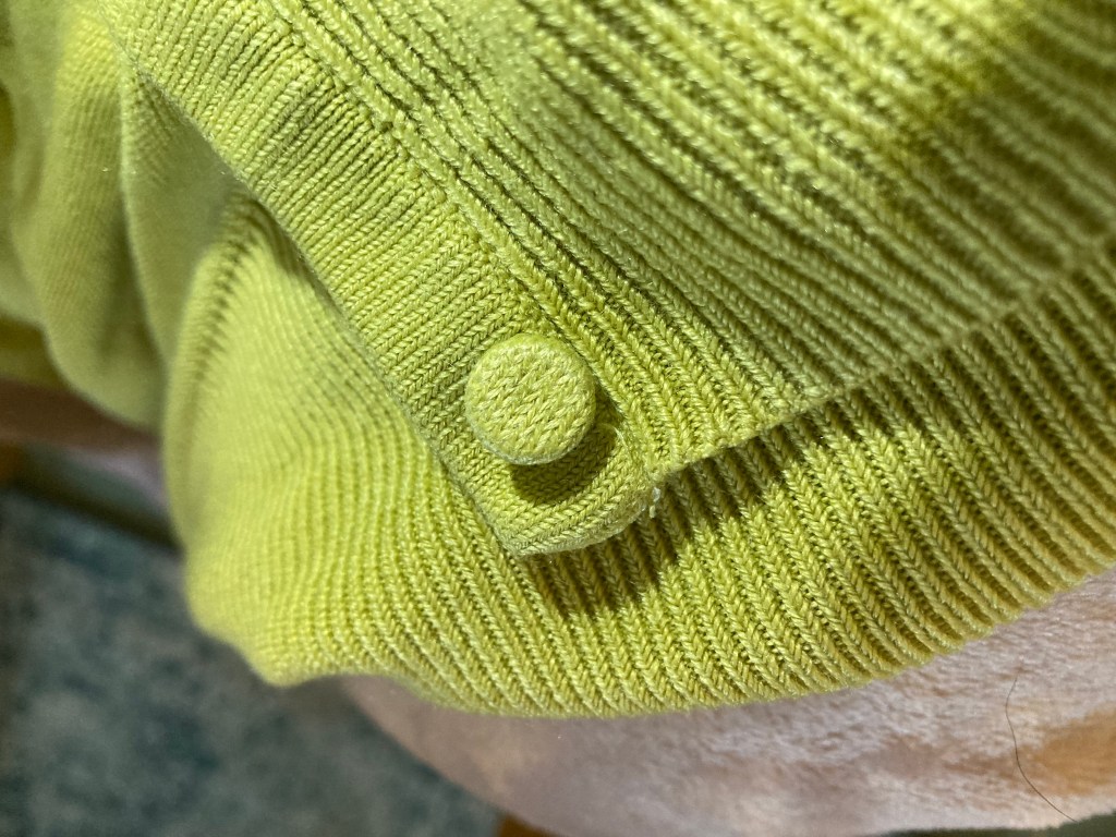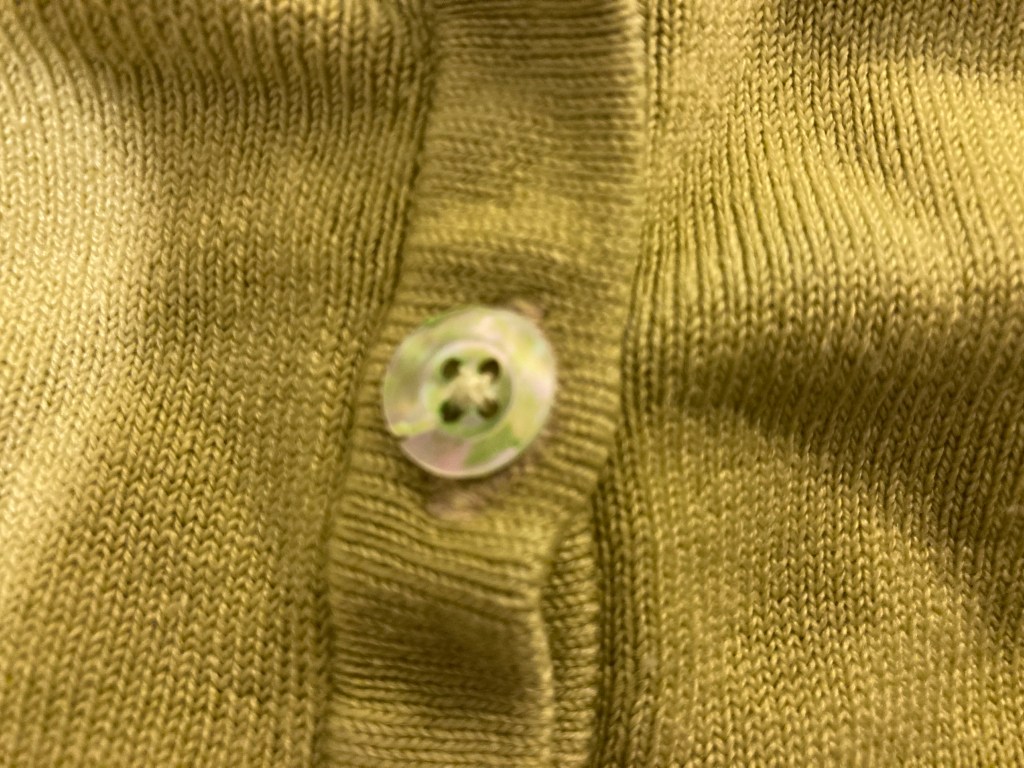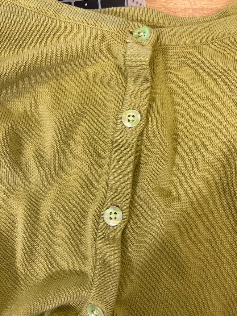 This gave just enough colour but was translucent enough to show the blue/pink/green iridescence of the mother of pearl. I sewed them on and now have buttons that match the cardigan. I’m not sure how long the colour will last but I can always grab that green Sharpie and touch up the colour. My favourite old cardigan not has a new lease of life!