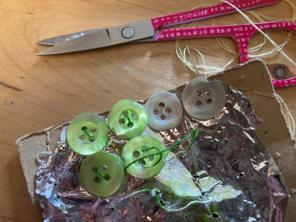 My attempt to buy some replacements at a haberdashery didn’t go well. There was nothing that grabbed me at all. I could have gone with plain white pearly ones but didn’t;t fancy that. Black might have worked but I couldn’t find any small enough. Finding the right shade of green – a sort of chartreuse – wasn’t helping. I tipped out the contents of my button jar for inspiration and found a card of little mother of pearl buttons, just the right size and enough for the whole cardigan. I’d already decided against white. Then I had a brainwave – I coloured in the buttons with a light green Sharpie.
