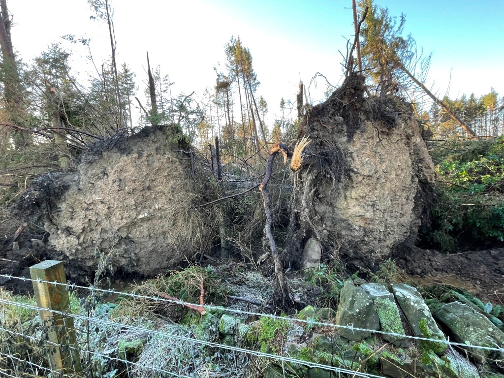 Enormous areas of woodland have been devastated, with trees uprooted, exposing massive root plates.