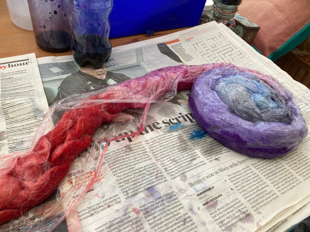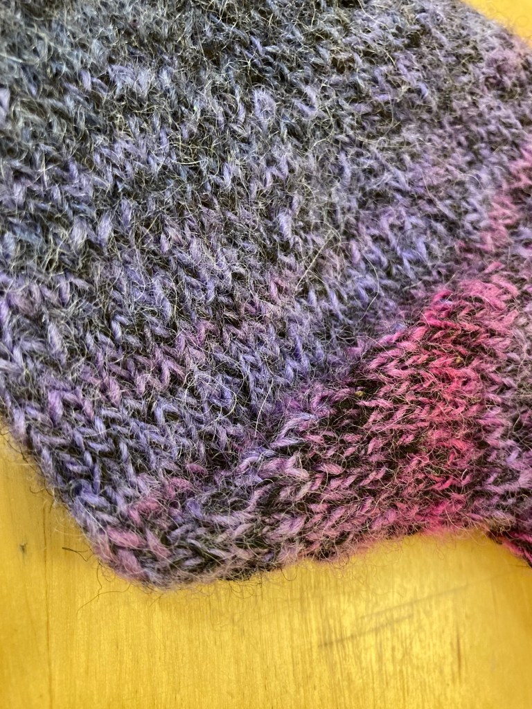 This pair began its journey last summer with one of my first dyeing experiments. I gradient dyed a braid of alpaca in shades of blue, navy, purple, pink and red. You can read about where my alpaca fibre came from here