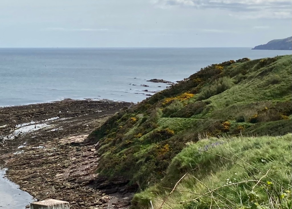 The northernmost of the artworks is in Cove, which lies north of St Abbs and south of the Torness nuclear power station. The village is tiny, situated at the top of the cliff. The harbour is privately owned, accessed by a steep gated path, which goes through a tunnel in the headland to the reach beach and harbour. Cellars leading off the tunnel, were once used to store fish but are now sealed off for safety. The landowners request that photos of the harbour are not published to maintain the unspoilt character of the place, but here you can just make out the buildings at the edge of the hidden bay and harbour.