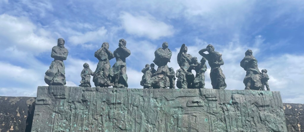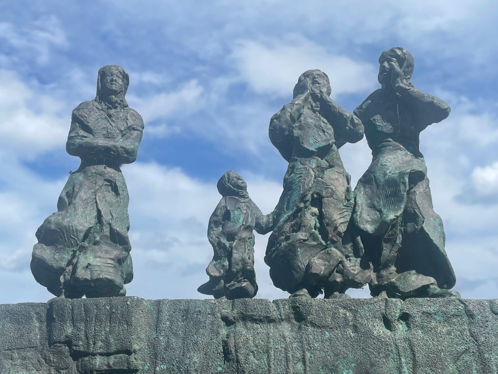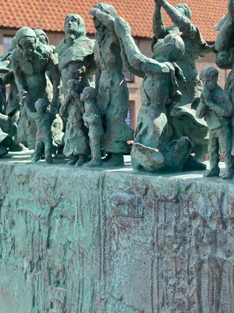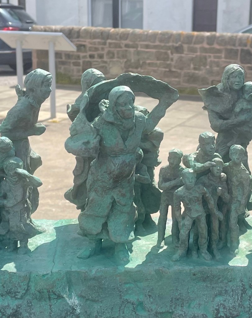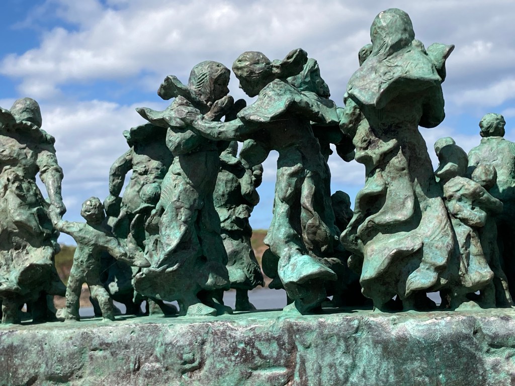 Though most of the figures stare out to sea, at the back of the sculpture the detail is still as perfect. A pair of women hug to console each other.
