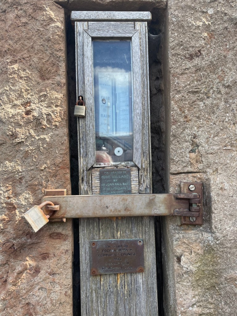 A barometer stands set into a rock at the corner of Cove car park. This was restored and resited there in the 1990s. The plaque indicated that this was presented around 1861, predating the fishing disaster. There is a cruel irony that this provided the means to predict the fatal storm.