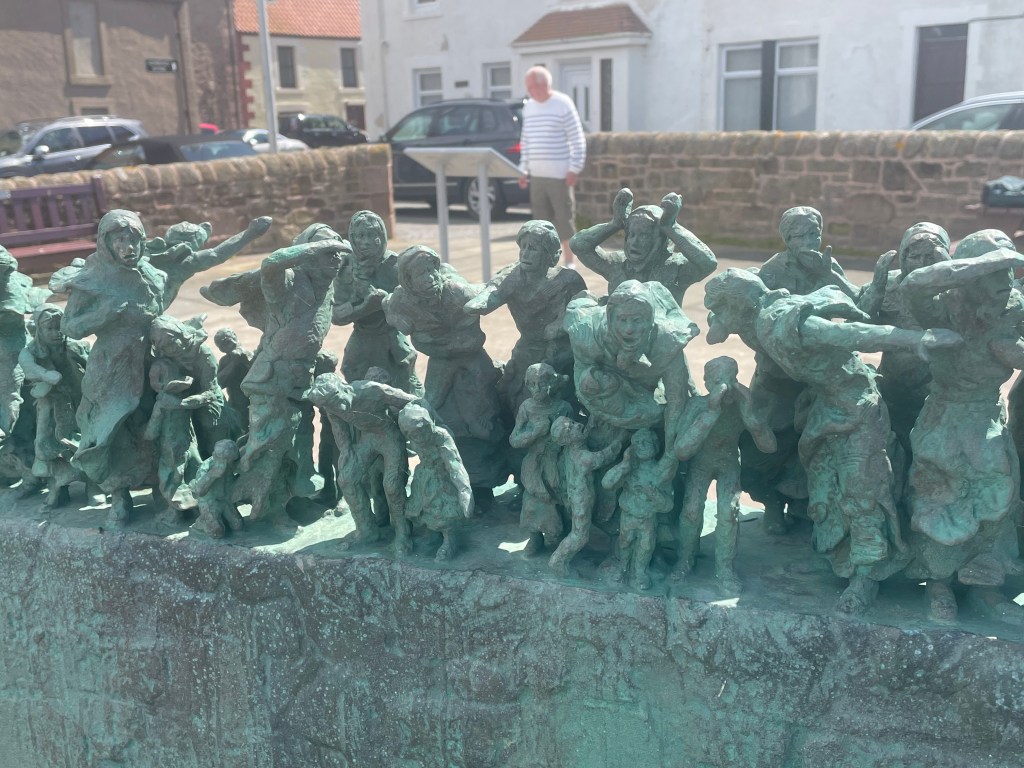 Moving south to Eyemouth there is a much larger artwork in the series, appropriate to the size of this small town and that it suffered the greatest loss of life in the storm of 1881: 129 of the 189 who died. This represented some 10% of the male population and there are more figures depicted here to represent larger numbers of family members affected.