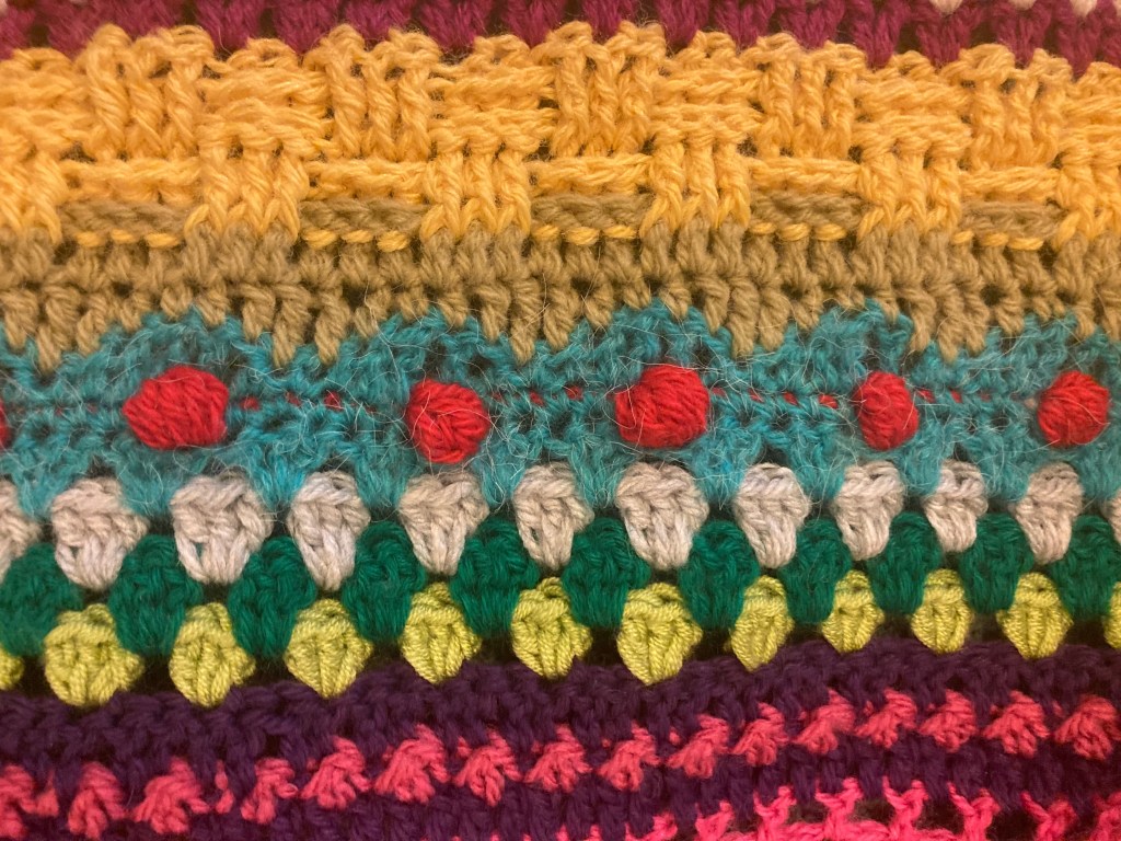 I used Sirdar pattern 10128 – a sleeveless pullover with a round neck and wide shoulders/drop sleeves. and used all the colours of handspun yarn instead of the suggested four in the pattern.
