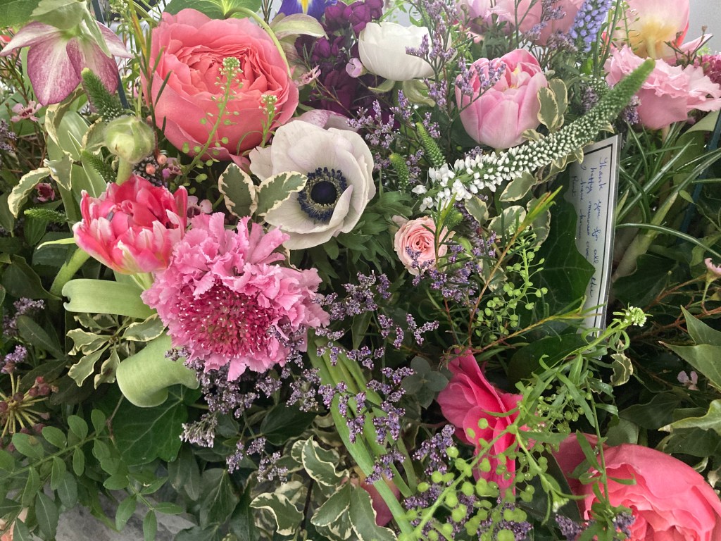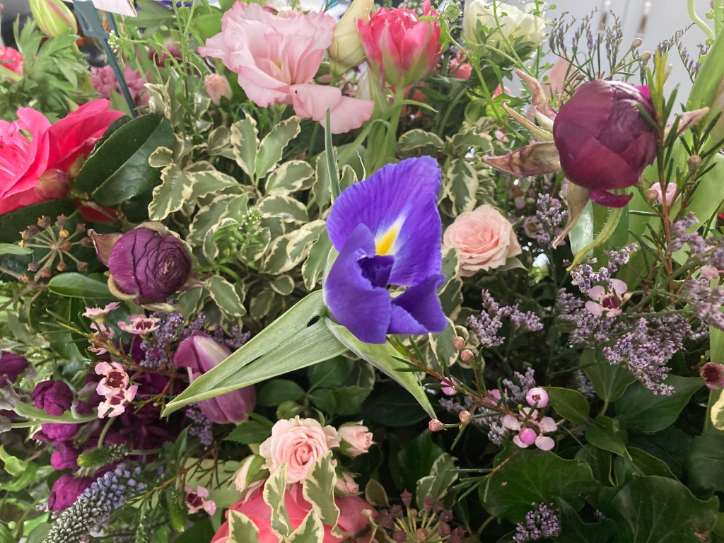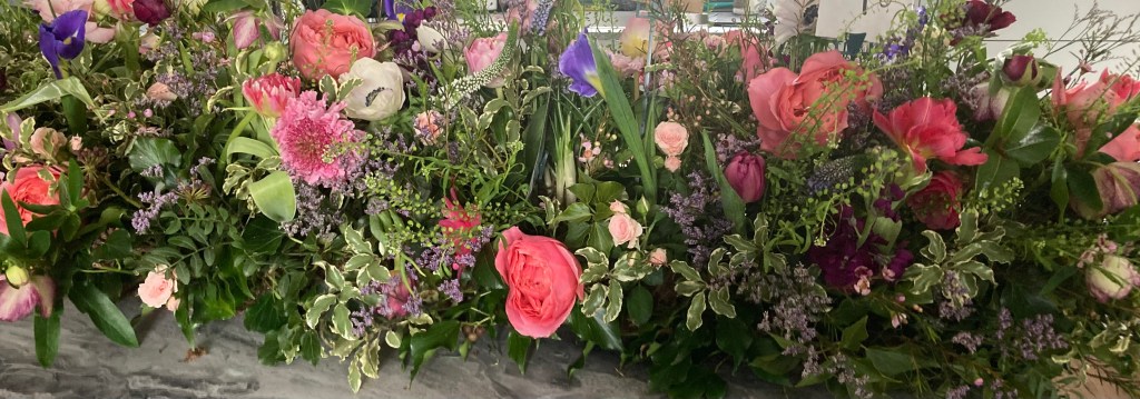 We met her during the saddest time, during the week after Mum’s death and spent a lovely hour with Polly by the wood-burning stove in the cabin where she works. Polly’s style is very much inspired by nature. The spray she created resembles a spring meadow, including tulips, ranunculus, spray and tea roses, iris, lizianthus and anemones, in shades of pink, purple and white with complementary foliage. The peachy pink roses were like my Dad’s favourite peach rose in the garden.