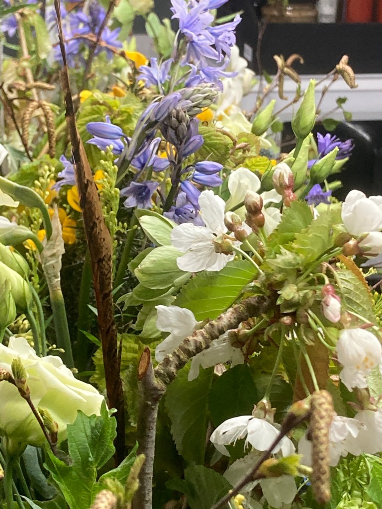 She created something beautiful to reflect the countryside that Kevin loved so much. It included bluebells, forget-me-nots, cherry blossom , rhododendron and wild foliage along with cream narcissus and lizzianthus.