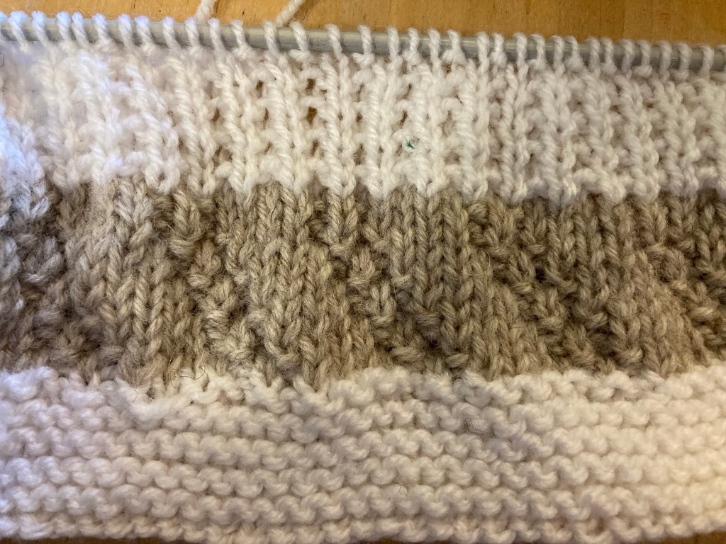 Yvonne writes, “Well guys it’s that time of the week again and time for the next 10 rows. I’m sorry to say that it’s a little bit harder. Also please remember that the first and last 8 stitches are in garter stitch throughout. So here we go.”