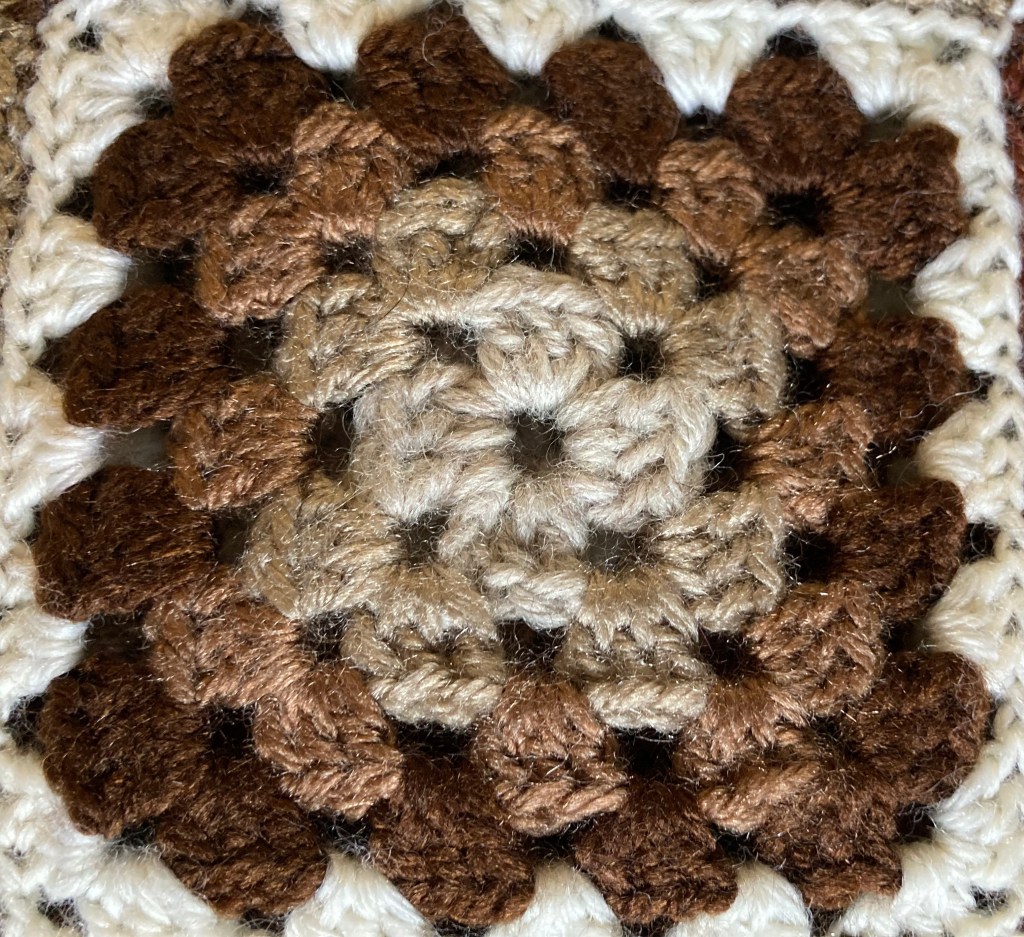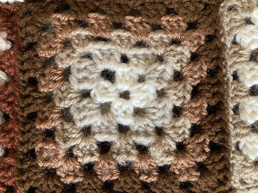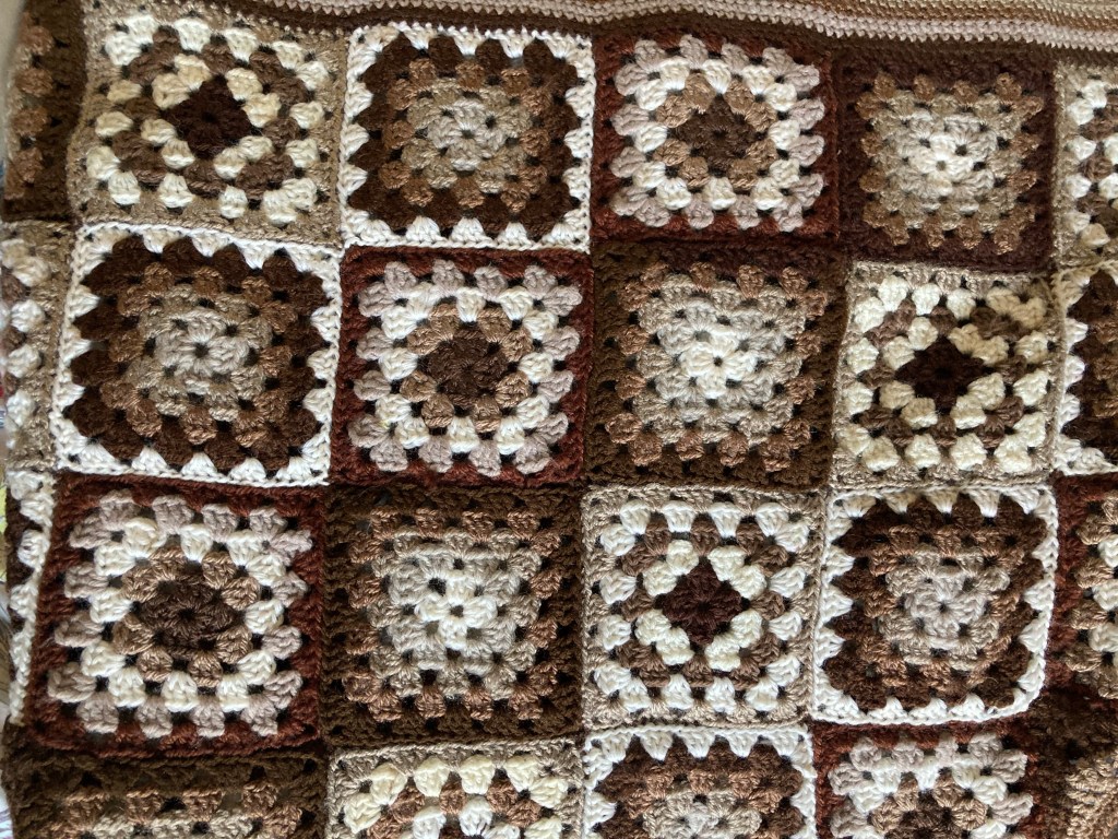 I’ve also been making lots of granny squares, most of which I made up into a sleeveless pullover. I used shades of brown, beige and white, crocheted them together and added a double crochet edging.