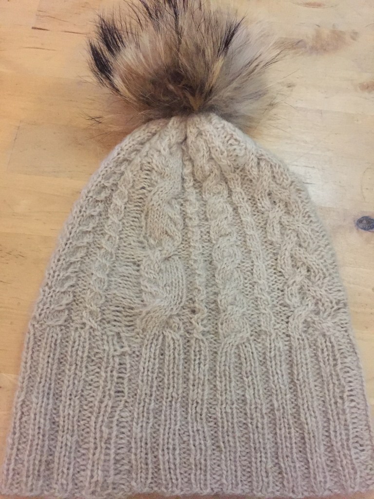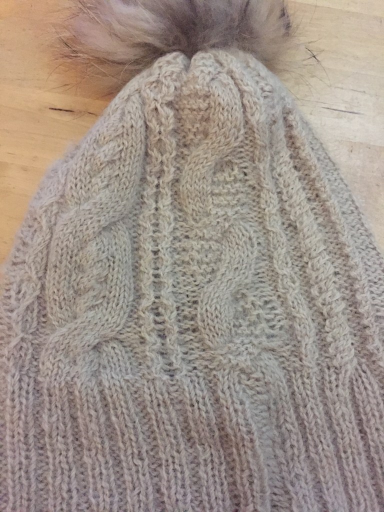 I bought a furry pompom to go on the top – it is attached with a press stud to remove for washing (or changing on to other hats). I wear it often during the winter months – it is delightfully warm and cosy.